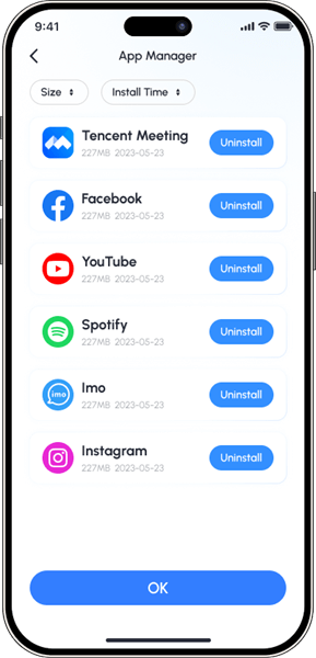View all your apps in one simple list, sort and filter apps by size or install date to identify the biggest space-hogs.